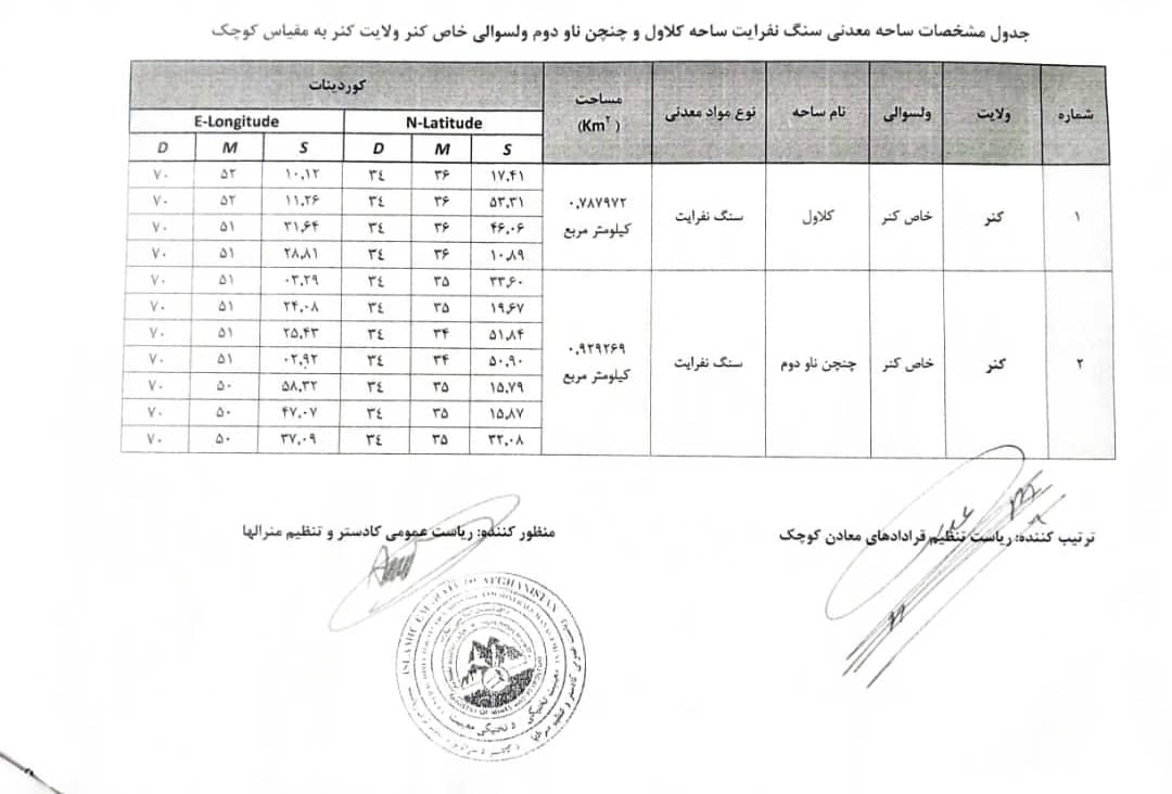 جدول مشخصات ساحه معدنی سنگ نفرایت ساحه کلاول و چنچن ناو دوم ولسوالی خاص کنر ولایت کنر به مقیاس کوچک