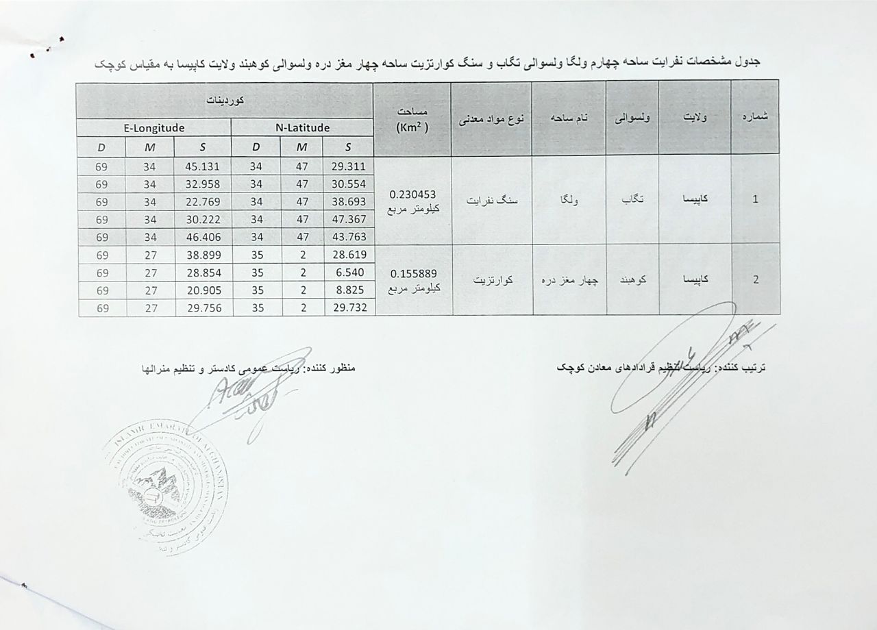 جدول مشخصات نفرایت ساحه چهارم ولگا ولسوالی تگاب و سنگ کوارتزیت ساحه چهار مغز دره ولسوالی کوهبند ولایت کاپیسا به مقیاس کوچک
